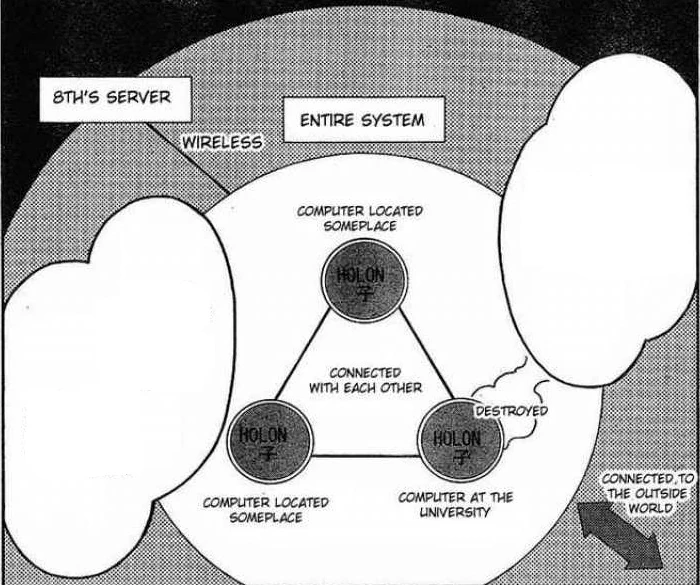 The HOLON is a supercomputer composed of three servers at different locations. According to John, the HOLON is Japan's third most powerful supercomputer. True to this the HOLON has shown extraordinary processing and data hosting abilities, which John used to give everybody in Sakurami City an account to log in a special blog.